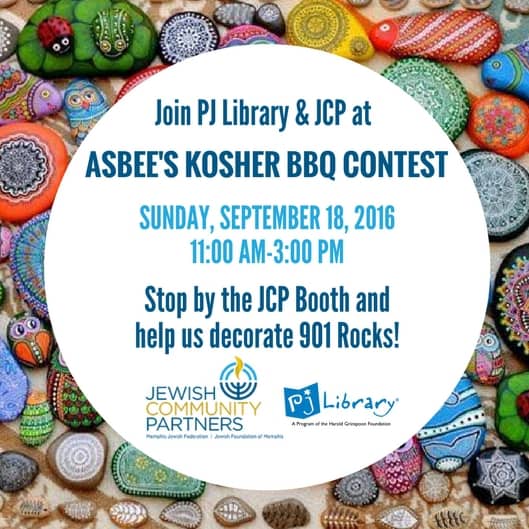 901 Rocks started as a fun way for Memphis neighbors to interact, painting and hiding rocks, then leaving hints to their whereabouts on a Facebook page. The game caught fire and spread, growing to more than 13,000 players by the end of the summer, and it’s still going strong. We’ll provide all your family needs to join the fun, so stop by our table at ASBEE’s Kosher BBQ Contest and join the fun.