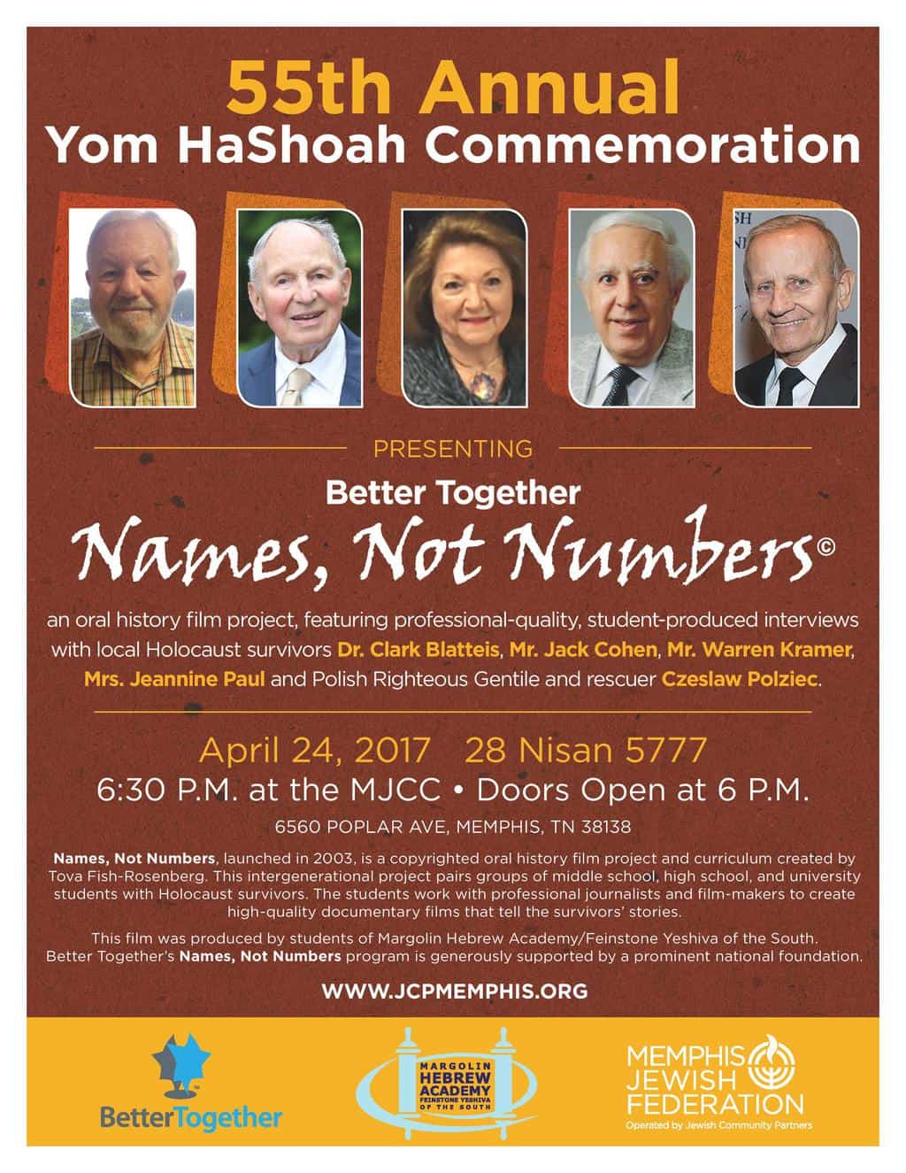 Laura Linder, President and CEO of Jewish Community Partners (JCP), announced this week that the Memphis Jewish community is invited to attend JCP’s 55th annual Yom HaShoah observance, featuring Better Together’s Names, Not Numbers program.