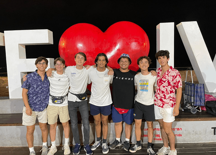Pictured from left to right: Jordan Infeld, Gabe Freedman, Drew Harris, Jacob Shapiro, Louis Reagler, Jack Benjamin, and Michael Hirsch are seen posing at the Tel Aviv Port statue.